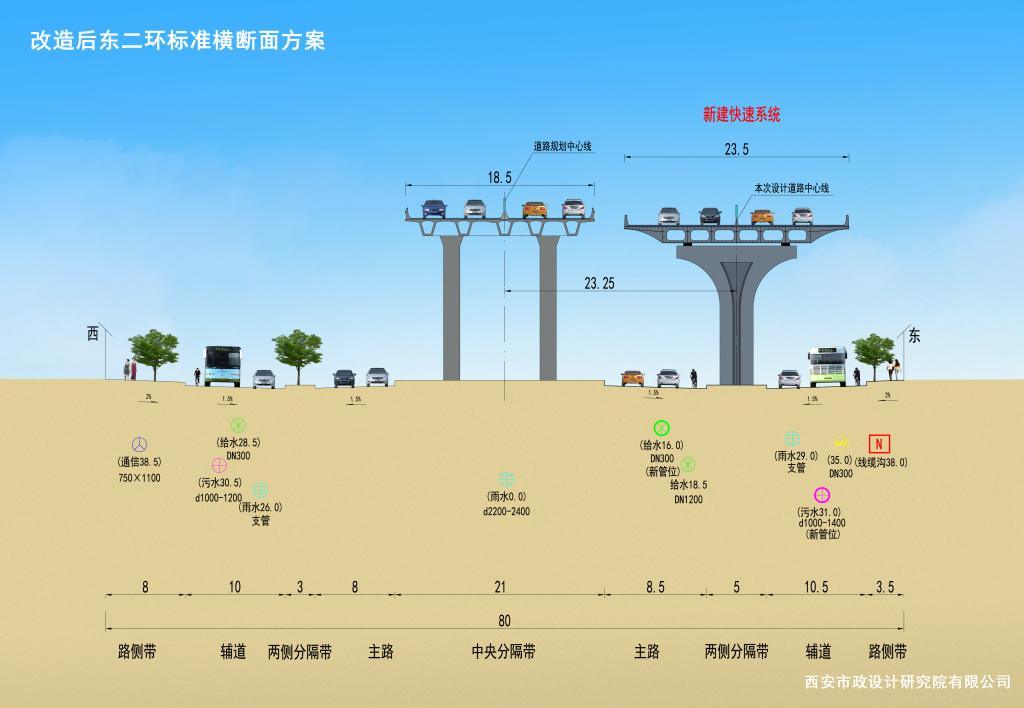 本次設(shè)計的南二環(huán)-東二環(huán)整體改造方案,由西二環(huán)昆明路立交至東北二環(huán)立交,全長約18.3km,含昆明路、太白路、太乙路、東南二環(huán)、咸寧路、東快速干道、東北二環(huán)以及西影路與西延路8處立交改造;建工路-新興南路快速路建設(shè)方案,由建工路東南二環(huán)立交至新興南路三環(huán)立交,全長約6km,含東南二環(huán)、萬壽路、幸福路、新興南路與長鳴路、田馬路、東三環(huán)立交的建設(shè)和改造。