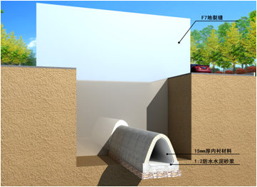 雁塔路(小寨東路-南二環(huán))現(xiàn)狀雨水磚砌管涵建于20世紀(jì)50年代,現(xiàn)狀磚砌管涵為圓拱形,內(nèi)徑為1.5m,由于該現(xiàn)狀雨水管涵其中一個(gè)井段橫跨f7地裂縫,地裂縫經(jīng)過(guò)近60年的發(fā)育,造成了磚砌管涵基礎(chǔ)發(fā)生了不均勻沉降,產(chǎn)生了近40cm的錯(cuò)臺(tái),導(dǎo)致磚涵內(nèi)積水外滲至周圍土體,嚴(yán)重影響了道路結(jié)構(gòu)強(qiáng)度及管道排水能力,急需對(duì)該現(xiàn)狀磚涵進(jìn)行修補(bǔ)。