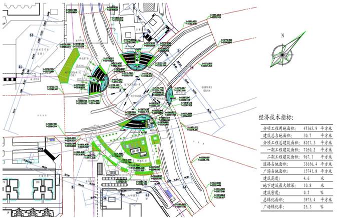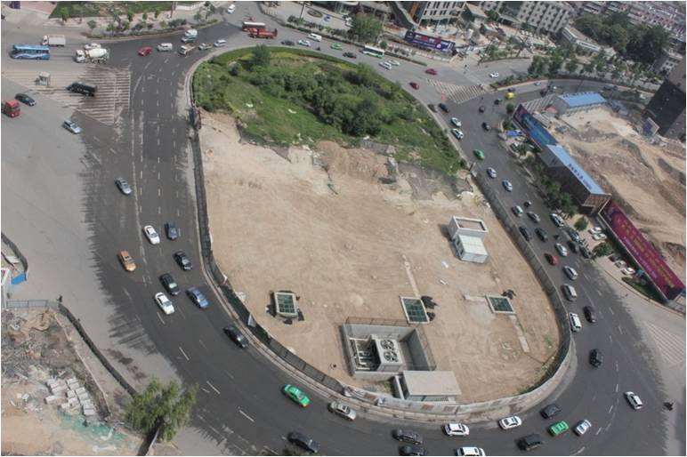 堡子村盤道位于長樂東路、紡北路、電廠東路、紡西街、紡建路五條城市現(xiàn)狀道路的交叉口。改造前該盤道為地面單向四車道交通盤道,中心島周長約380m,道路總用地約3.8ha,是城市現(xiàn)狀及現(xiàn)行紡織城分區(qū)規(guī)劃中的主要交通樞紐和城市空間節(jié)點。
