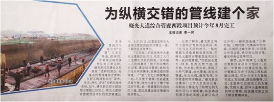 該項(xiàng)目于2018年12月開工建設(shè),目前已建設(shè)過半,計(jì)劃今年8月底竣工。三分院項(xiàng)目組成員在后續(xù)施工配合過程中,克服困難、主動(dòng)服務(wù),為項(xiàng)目建設(shè)提供有力技術(shù)保障。建成后的曉光大道綜合管廊將與現(xiàn)狀的龍騰路、龍翔大道、西坪大道以及小韓村路等路段綜合管廊連通,形成蟠龍新區(qū)地下綜合管廊體系,使地下管線“血脈”互聯(lián)暢通。