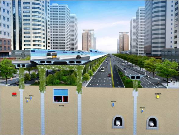 由于昆明路高架沿線地下管線極其復(fù)雜,同時(shí)又與地鐵、綜合管廊、地裂縫等交織,為保證工程的合理性,項(xiàng)目設(shè)計(jì)組多次實(shí)地踏勘、反復(fù)研究,采用了大跨度預(yù)應(yīng)力蓋梁、懸臂梁體系等工程方案對(duì)地下管線、構(gòu)筑物和地裂縫實(shí)現(xiàn)精準(zhǔn)避讓。同時(shí),為減少行車噪音對(duì)橋梁兩側(cè)居民生活的干擾,在該項(xiàng)目中首次使用了高4.5m的聲屏障,并在聲屏障頂部設(shè)置LED光源,滿足照明與景觀要求。