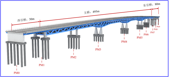 香槐六路跨灞河橋工程位于灞河隴海鐵路大橋下游至灞橋區(qū)、浐灞生態(tài)園區(qū)交界處,距北三環(huán)橋約700m,西起歐亞六路,東接香槐六路,全長(zhǎng)732m,為特大型橋梁。其中主橋總長(zhǎng)495m,采用六跨57.5+71+120+120+70+57.5m變高連續(xù)鋼桁梁結(jié)構(gòu),引橋及引道長(zhǎng)237m。橋梁采用雙層橋面,上層橋面為機(jī)動(dòng)車道,寬25m,下層橋面為人行通道,寬11m。其主跨120m跨度及充分利用鋼桁梁結(jié)構(gòu)特點(diǎn),采用了人、車分離式雙層橋面布局,均屬灞河上同類橋梁的首創(chuàng)。