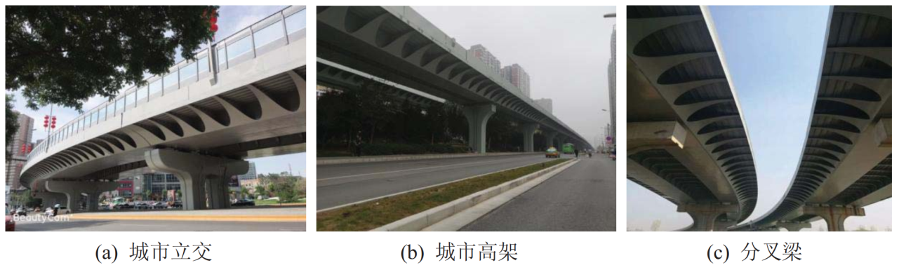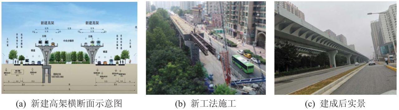 (1)上部結(jié)構(gòu)創(chuàng)新及關(guān)鍵技術(shù):發(fā)明了一種功能分區(qū)設(shè)計(jì)的部分敞口鋼梁,創(chuàng)新了城市鋼橋上部結(jié)構(gòu)的主梁結(jié)構(gòu)形式。提出的功能分區(qū)設(shè)計(jì)的部分敞口鋼梁,較常規(guī)鋼板(組合)梁或鋼箱(組合)梁造型更加美觀;鋼主梁結(jié)構(gòu)體系主、次清晰,受力合理,其每平米用鋼量較常規(guī)鋼箱梁橋可節(jié)約15%~20%;主要受力構(gòu)件和次要受力構(gòu)件可視橋下實(shí)際情況同期或者分期施工,新工法對城市復(fù)雜交通環(huán)境的適應(yīng)性更高,施工效率可以提高2~3倍。由于新型鋼梁自重輕、整體性強(qiáng),施工工法適應(yīng)性強(qiáng),非常適用于城市各類鋼橋,尤其是高架橋和立交橋梁中的變寬梁和分叉梁。