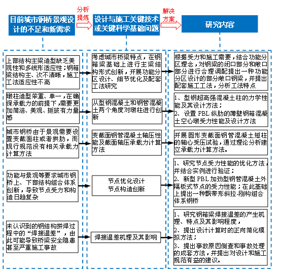 城市橋梁建設(shè)受到地形、管線、既有交通、城市規(guī)劃方案等諸多限制,其景觀設(shè)計(jì)往往和橋梁結(jié)構(gòu)的創(chuàng)新、優(yōu)化緊密聯(lián)系在一起。項(xiàng)目團(tuán)隊(duì)經(jīng)十余年的研究,旨在分析和解決城市鋼橋景觀設(shè)計(jì)和施工過程中,由于結(jié)構(gòu)造型日趨新穎、結(jié)構(gòu)構(gòu)造和受力日趨復(fù)雜、城市環(huán)境限制條件多樣等帶來的關(guān)鍵技術(shù)問題。