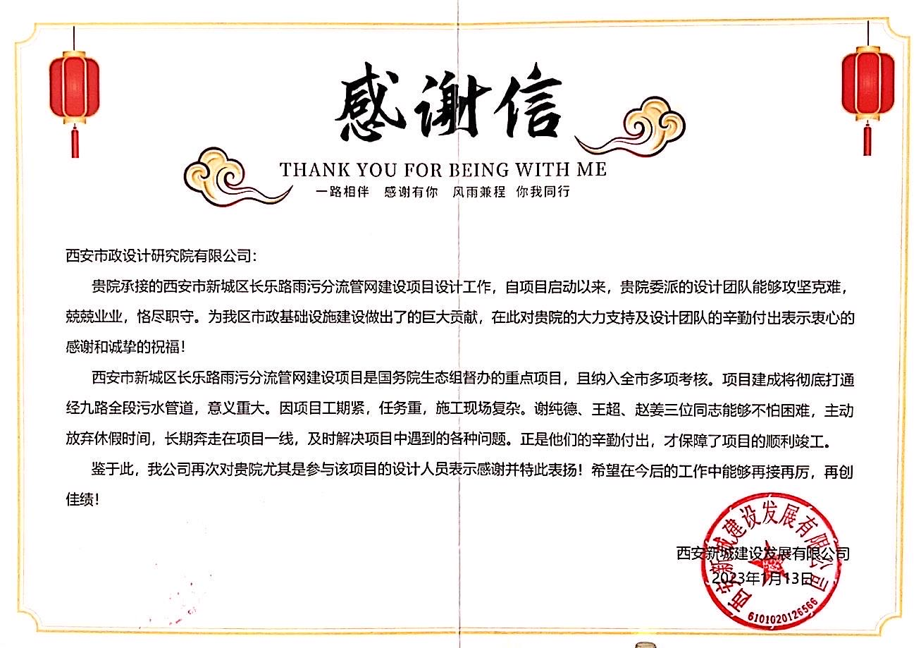 近日,科源公司收到一封來自西安新城建設(shè)發(fā)展有限公司的感謝信,對科源公司在新城區(qū)長樂路雨污分流管網(wǎng)建設(shè)項目中的設(shè)計工作給予充分肯定,同時對項目組成員的辛勤付出表示感謝。
