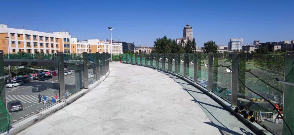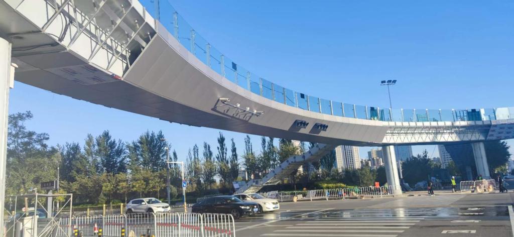 榆林高新區(qū)建業(yè)大道-長(zhǎng)興路過街人行天橋(高新一中人行天橋)位于榆林市建業(yè)大道與長(zhǎng)興路交叉口,主橋采用直徑83m的環(huán)形變截面鋼箱梁結(jié)構(gòu),主橋全長(zhǎng)為245.05m,梁高1.2-1.8m,主橋?qū)?m,橋梁總面積2047㎡。天橋所有方向均采用一跨跨越現(xiàn)狀道路,主跨55.985m,在同類人行天橋中跨徑較大。通透的玻璃欄桿搭配曲線明快的主梁,猶如一條流動(dòng)的綢帶,簡(jiǎn)潔現(xiàn)代,婉約流暢。該天橋?yàn)橛芰指咝乱恢性O(shè)置了專用梯道接入校內(nèi)方便師生使用,同時(shí)增加了電渦流調(diào)諧質(zhì)量阻尼器提升行人通行的舒適性。