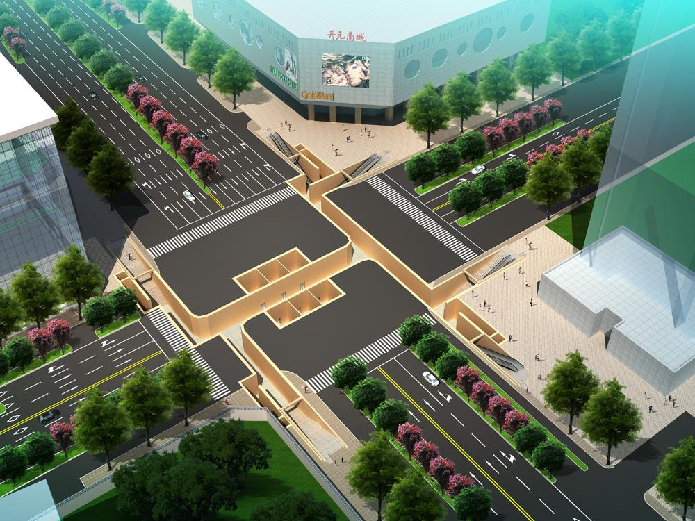 該項(xiàng)目設(shè)計(jì)人行通道平面采用工字型布局,總建筑面積2126m2,主通道寬6m,埋深7.7m,凈高3.3m。共設(shè)七個(gè)出入口,四部自動(dòng)扶梯,三部無(wú)障礙電梯;內(nèi)部設(shè)有變配電室、通風(fēng)機(jī)房、水泵房、管理用房、庫(kù)房等。主體結(jié)構(gòu)為現(xiàn)澆鋼筋混凝土結(jié)構(gòu),采用蓋挖法施工工藝,以減小施工過(guò)程對(duì)地面交通影響。出入口為鋼結(jié)構(gòu)與玻璃組合,體現(xiàn)結(jié)構(gòu)與功能統(tǒng)一,立面效果與周邊建筑緊密結(jié)合,協(xié)調(diào)、簡(jiǎn)潔、通透。設(shè)計(jì)內(nèi)容包括建筑、結(jié)構(gòu)、給排水、暖通、電氣、道路、市政管線等多個(gè)專(zhuān)業(yè)。
