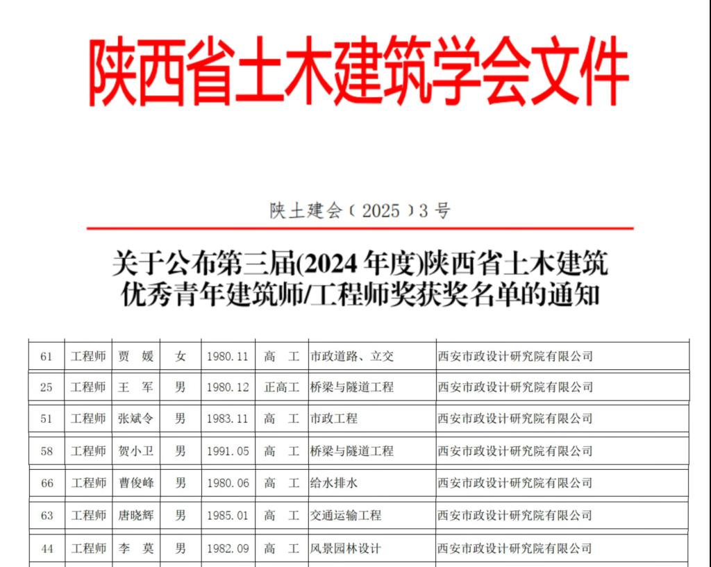 2月11日,陜西省土木建筑學(xué)會(huì)公布了第三屆(2024年度)陜西省土木建筑優(yōu)秀青年工程師獎(jiǎng)獲獎(jiǎng)名單,我公司7名青年設(shè)計(jì)師獲此殊榮。